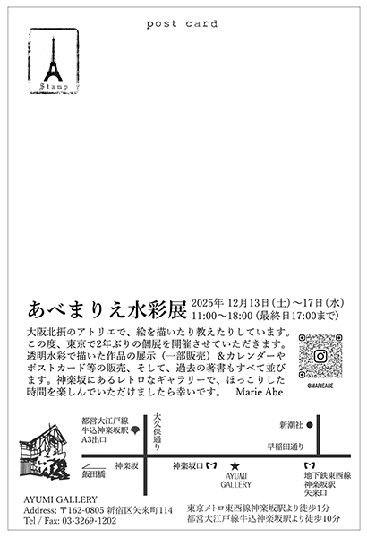 それでは、12月の期間中、神楽坂の散策も兼ねて、是非是非、『AYUMIギャラリー』にも足をお運びくださいね。皆様のお越しを心よりお待ちしております。(私はずっと在朗しております。)